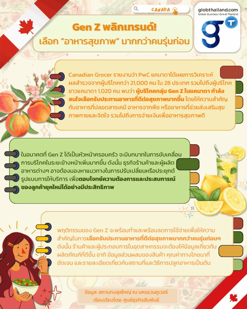 Canadian Grocer รายงานว่า PwC แคนาดาได้เผยการวิเคราะห์ผลสำรวจจากผู้บริโภคกว่า 21,000 คน ใน 28 ประเทศ รวมไปถึงผู้บริโภคชาวแคนาดา 1,020 คน พบว่า ผู้บริโภคกลุ่ม Gen Z ในแคนาดา กำลังสนใจเลือกรับประทานอาหารที่ดีต่อสุขภาพมากขึ้น โดยให้ความสำคัญกับอาหารที่ปลอดสารเคมี อาหารจากพืช หรืออาหารที่ช่วยส่งเสริมสุขภาพกายและจิตใจ รวมไปถึงการจ่ายเงินเพื่ออาหารสุขภาพดี ซึ่งชาว Gen Z ของแคนาดากว่าร้อยละ 20 เลือกรับประทานอาหารมังสวิรัติหรือวีแกน เมื่อเทียบกับร้อยละ 12 ของประชากรทั้งหมด โดยอันดับที่ 2 และ 3 คือ เนื้อสัตว์ทางเลือก และเครื่องดื่มแอลกอฮอล์ตามลำดับ