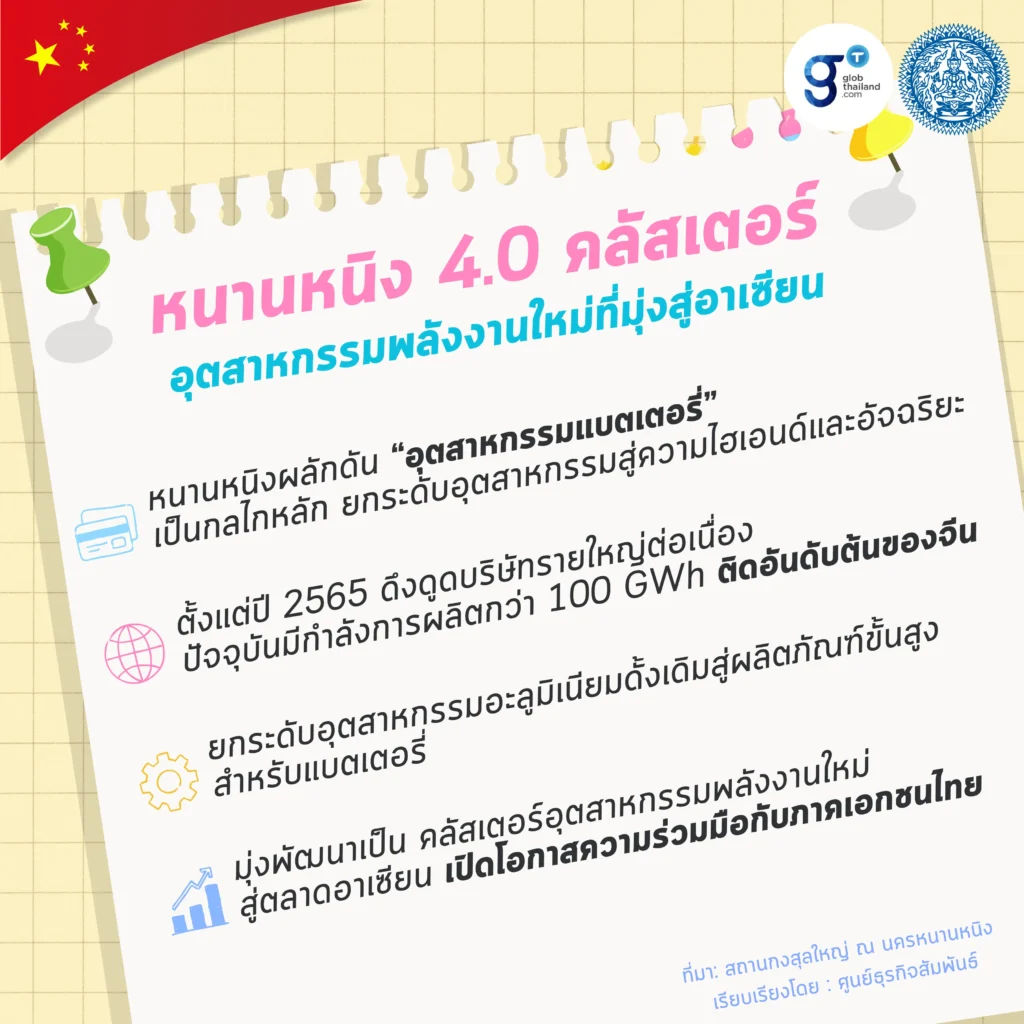 “อุตสาหกรรมแบตเตอรี่” กำลังเป็นกลไกสำคัญในการเติบโตของภาคอุตสาหกรรมหนานหนิง ที่จะช่วยยกระดับโครงสร้างไปสู่ “ความไฮเอนด์และความอัจฉริยะ” นับตั้งแต่ปี 2565 นครหนานหนิงได้เร่งส่งเสริมการดึงดูดการลงทุนจากบริษัทชั้นนำในอุตสาหกรรมแบตเตอรี่อย่างจริงจังและต่อเนื่อง ซึ่งปัจจุบัน นครหนานหนิงมีกำลังการผลิตแบตเตอรี่ได้มากกว่า 100GWh ทำให้สูงเป็นอันดับต้น ๆ ของประเทศจีน