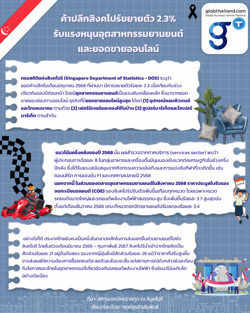 กรมสถิติแห่งสิงคโปร์ (Singapore Department of Statistics – DOS) ระบุว่า ยอดค้าปลีกในเดือนมิถุนายน 2568 ที่ผ่านมา มีการขยายตัวร้อยละ 2.3 เมื่อเทียบกับช่วงเดียวกันของปีก่อนหน้า โดยมีอุตสาหกรรมยานยนต์เป็นแรงขับเคลื่อนหลัก มูลค่ารวมของยอดค้าปลีกทั้งหมดอยู่ที่ 4 พันล้านดอลลาร์สิงคโปร์ ซึ่งร้อยละ 13.6 มาจากยอดขายของช่องทางออนไลน์ อีกทั้งธุรกิจที่มียอดขายออนไลน์สูงสุด ได้แก่ [1] อุปกรณ์คอมพิวเตอร์และโทรคมนาคม ตามด้วย [2] เฟอร์นิเจอร์และของใช้ในบ้าน [3] ซูเปอร์มาร์เก็ตและไฮเปอร์มาร์เก็ต ตามลำดับ