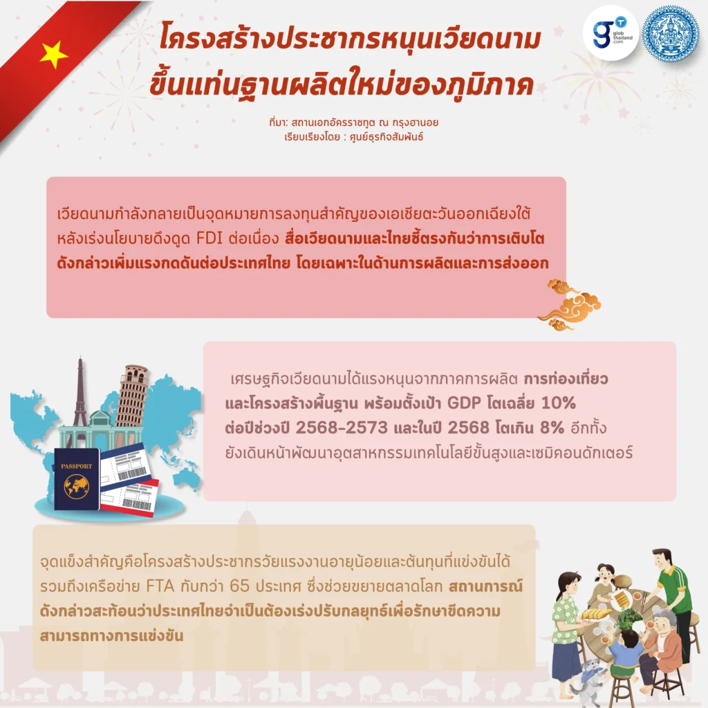 อีกหนึ่งจุดแข็งของเวียดนามคือโครงสร้างประชากรที่มีอายุแรงงานเฉลี่ยราว 33 ปี ต่ำกว่าประเทศไทยอย่างชัดเจน ประกอบกับต้นทุนแรงงานที่แข่งขันได้และกำลังแรงงานจำนวนมาก ทำให้เวียดนามถูกมองว่ามีศักยภาพเติบโตในระยะยาว นอกจากนี้ เวียดนามยังได้ลงนามความตกลงการค้าเสรีกับกว่า 65 ประเทศ ช่วยเปิดทางเข้าถึงตลาดโลกได้สะดวกยิ่งขึ้น การขยายบทบาทของเวียดนามในฐานะจุดหมายการลงทุนสำคัญ สะท้อนการเปลี่ยนแปลงเชิงโครงสร้างของเศรษฐกิจภูมิภาค และเป็นสัญญาณให้ไทยต้องเร่งปรับยุทธศาสตร์เพื่อรักษาความสามารถในการแข่งขันต่อไป