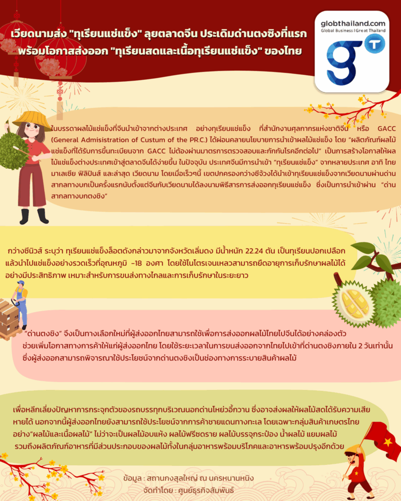 เวียดนามส่ง “ทุเรียนแช่แข็ง” ลุยตลาดจีน ประเดิมด่านตงซิงที่แรก พร้อมโอกาสส่งออก “ทุเรียนสดและเนื้อทุเรียนแช่แข็ง” ของไทย